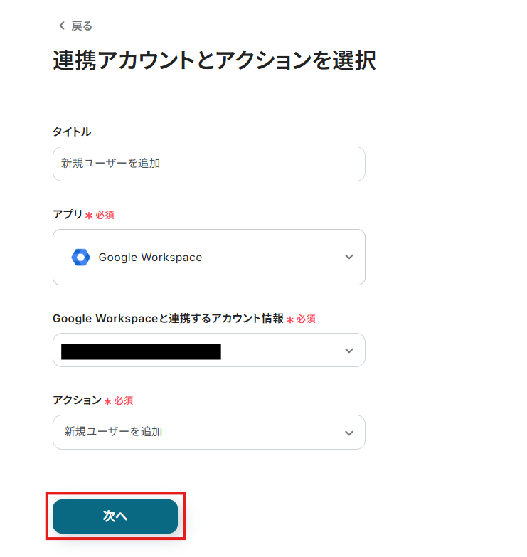 2.表示された画面で各項目を確認します。 アカウント情報を任意で設定し、トリガーアクションはそのままにして、「次へ」をクリックしましょう。