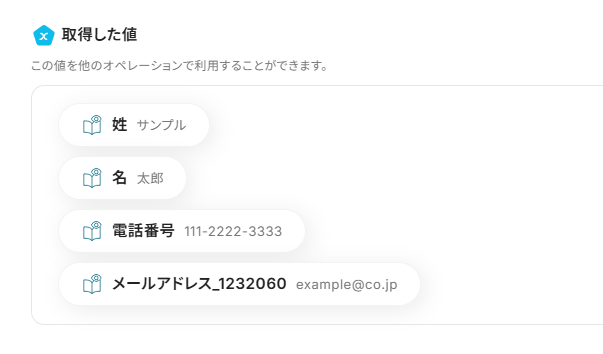 2.API接続設定を行います。 「姓」「名」「デフォルトのパスワード」「メインのメールアドレス」は、入力欄をクリックして表示されるアウトプット(取得した値)から選択してください。 ※「デフォルトのパスワード」は、一旦仮のパスワードとして設定します。今回は、アウトプット(取得した値)の電話番号を選択しています。