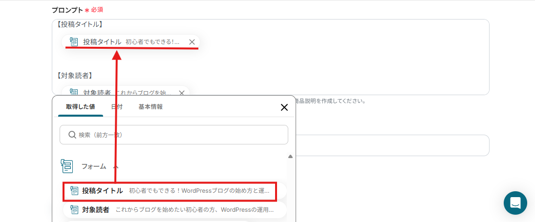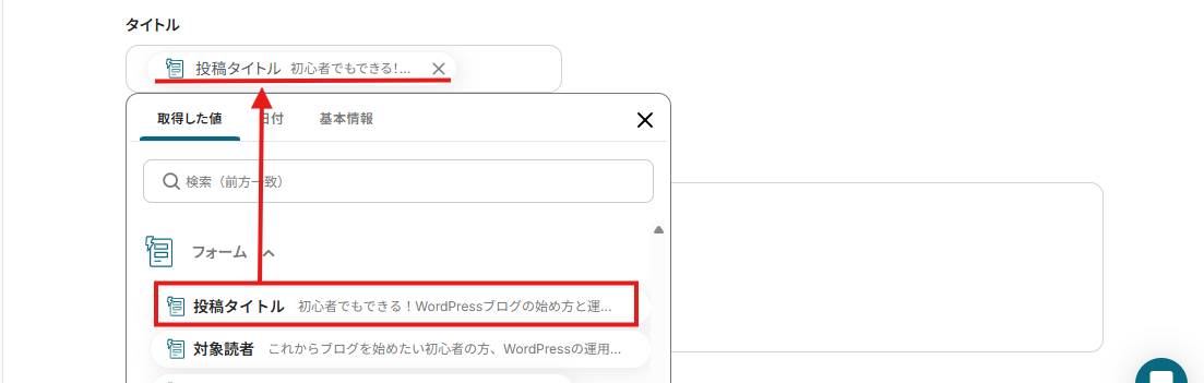 このように設定すると、フォームの回答から「投稿タイトル」を自動で取得しWordPressのタイトルを設定することができますよ!