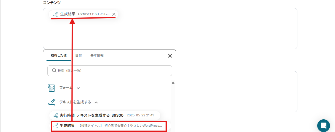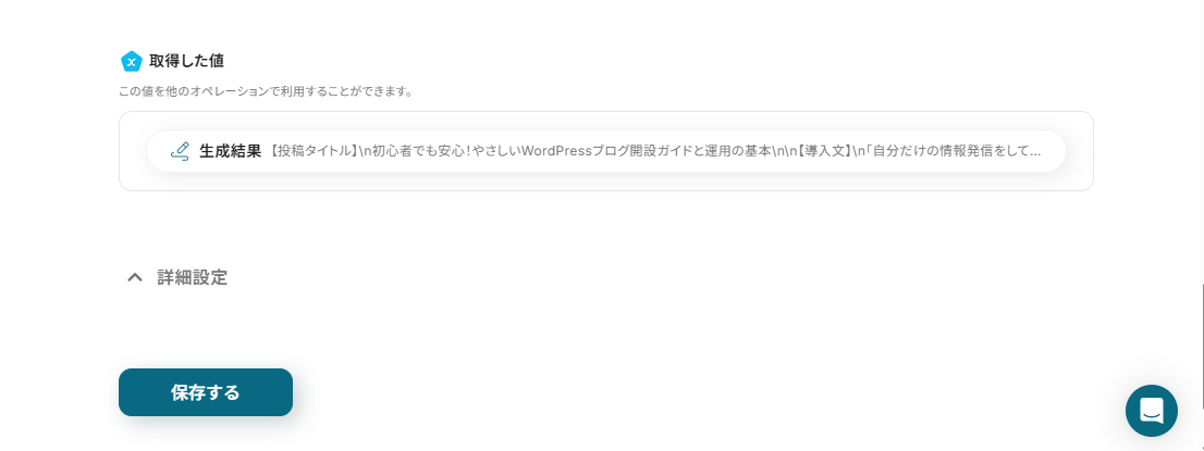 このように設定すると、フォームの回答をもとにAIが作成した記事を自動で取得し、WordPressのコンテンツに引用できますよ!
