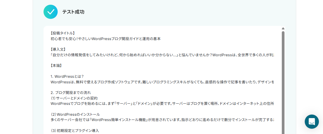 テストをクリックすると、AIが作成した記事が表示されます。指示通りの文章になっていることを確認したら、「保存する」ボタンを押しましょう。