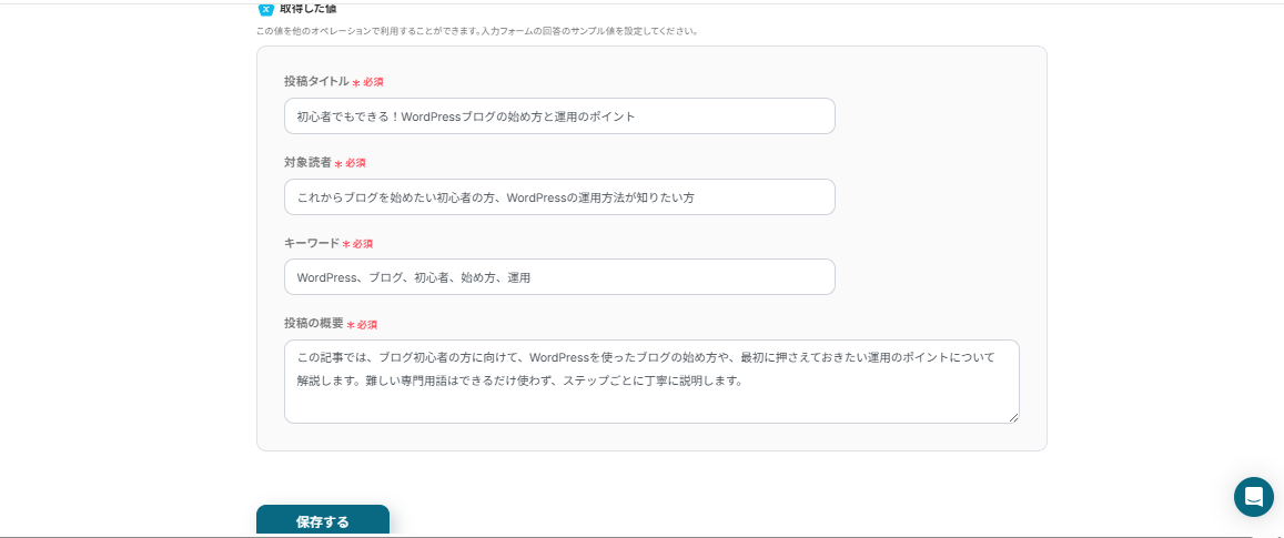 初期設定のまま使用すると、フォームに回答された「投稿タイトル」「対象読者」「キーワード」「投稿の概要」を取得し、自動でWordPress用のブログ記事を作成できます!