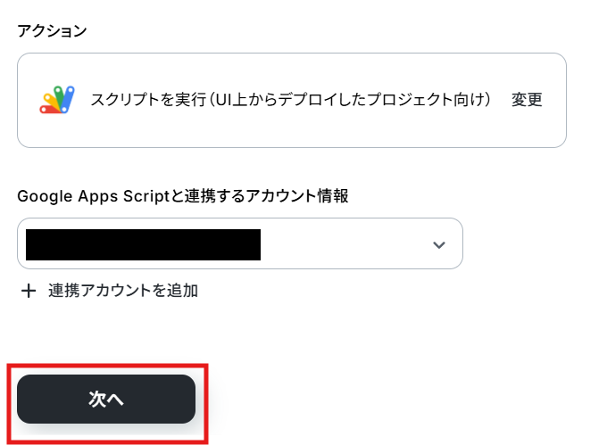 クリックすると以下の画面に移ります。 Googleフォームと同様に、ステップ1でマイアプリ連携したGoogle Apps Scriptのアカウント情報が自動で表示されます。 アクションは、「スクリプトを実行」のままで次に進みましょう!