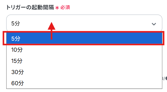 YoomがGoogleフォームの回答を確認する間隔を設定します。 編集欄をクリックし、5分、10分、15分、30分、60分から任意で選択してください。 ご利用プランにより設定できる最短の間隔が異なるため、ご注意ください。 なお、基本的にはそのプランの最短の起動間隔にしてお使いいただくことをおすすめします。