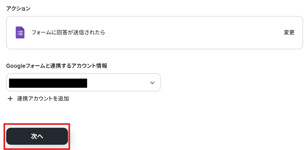 クリックすると以下の画面に移ります。 アカウント情報と書かれた項目にはステップ1でマイアプリ連携した際の情報が記載されています。 トリガーアクションは、「フォームに回答が送信されたら」のままで次に進みましょう!
