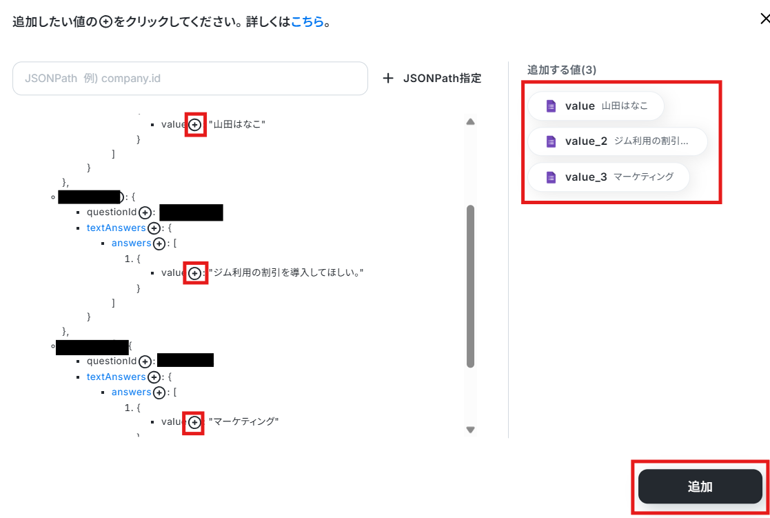 「value」と記載されている部分が、Googleフォームに送信された回答です。 追加したい項目の「+」をクリックすることで値を追加できます。 詳しくは下記をご参照ください。