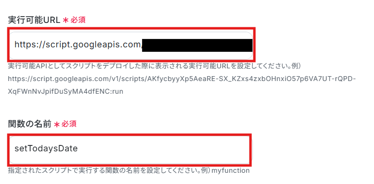 Google Apps ScriptをAPI経由で実行する方法 を参考に、「実行URL」と「関数の名前」を設定してください。
