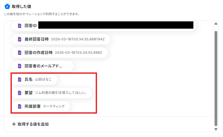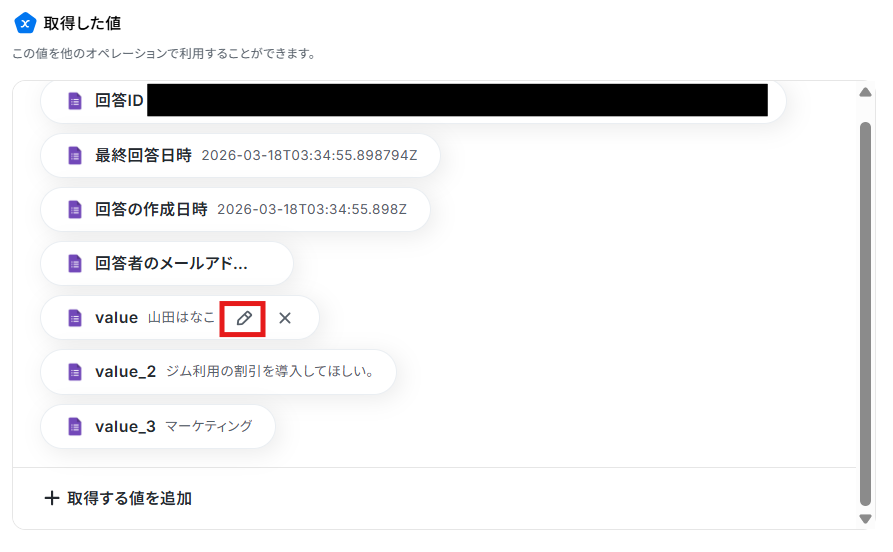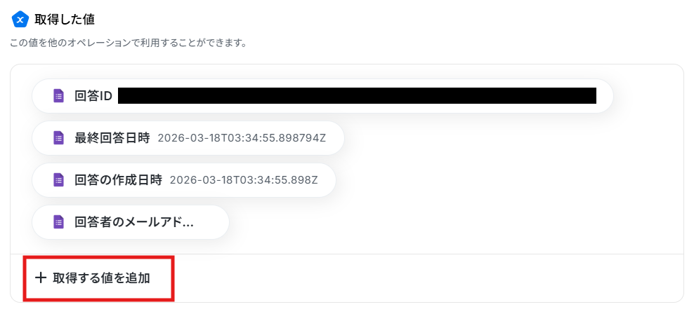 後続の処理で、上記以外の回答の値を使用したい場合は、手動で値を追加しましょう。 「+取得する値を追加」をクリックしてください。