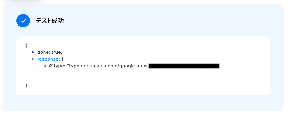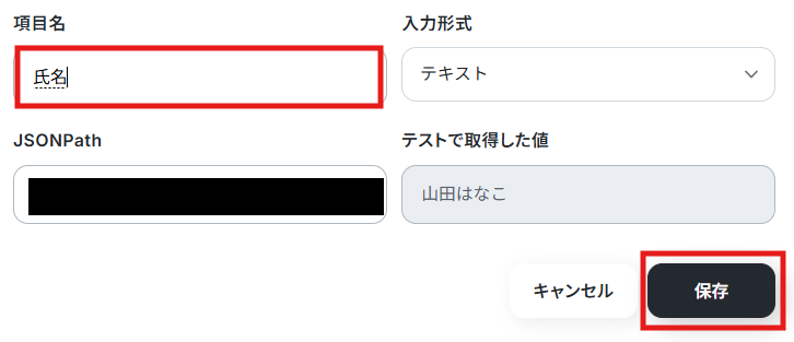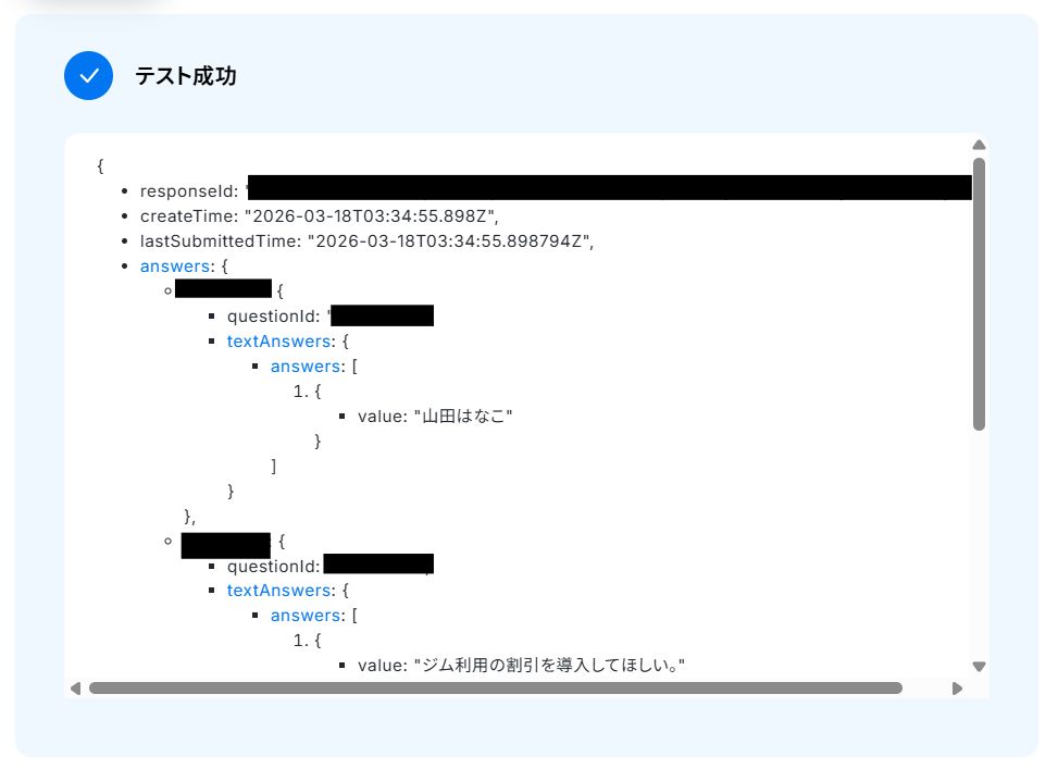 テストに成功すると、先ほどフォームに送信した回答内容が表示されます。