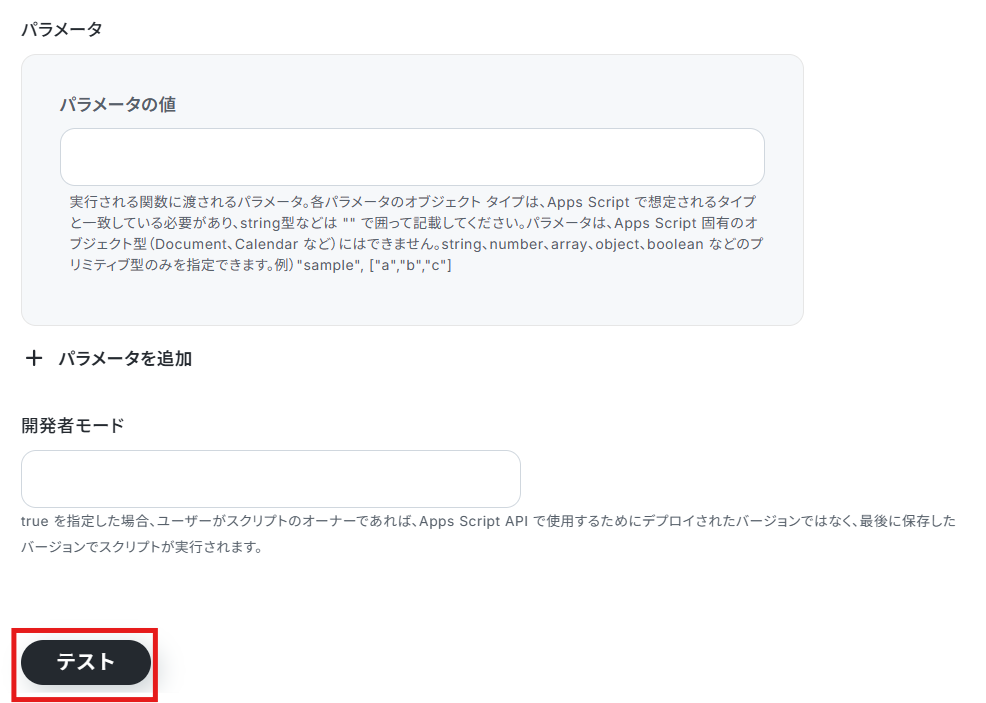 下記を任意で設定して、「テスト」をクリックします。