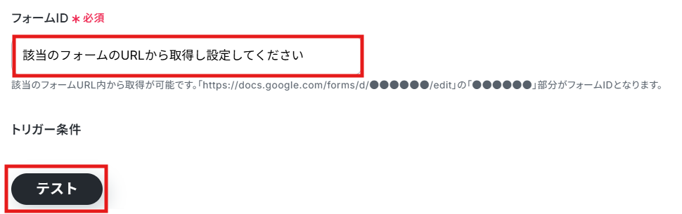 連携したいフォームIDを入力して、「テスト」をクリックしてください。