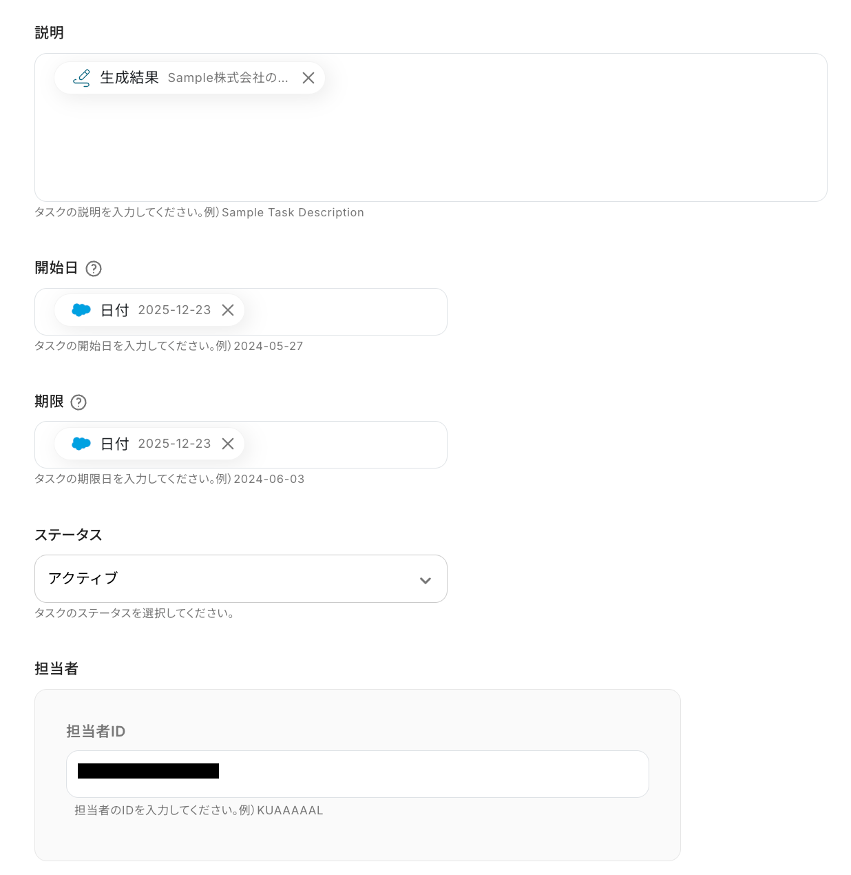 必須の設定項目は以上ですが、他にも「開始日」や「期限」「説明」などを設定することもできるので、適宜「取得した値」を活用しながら設定してみてくださいね!