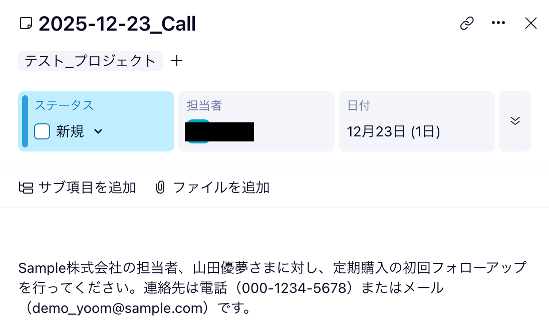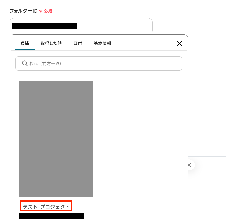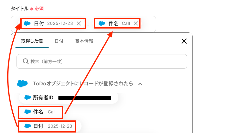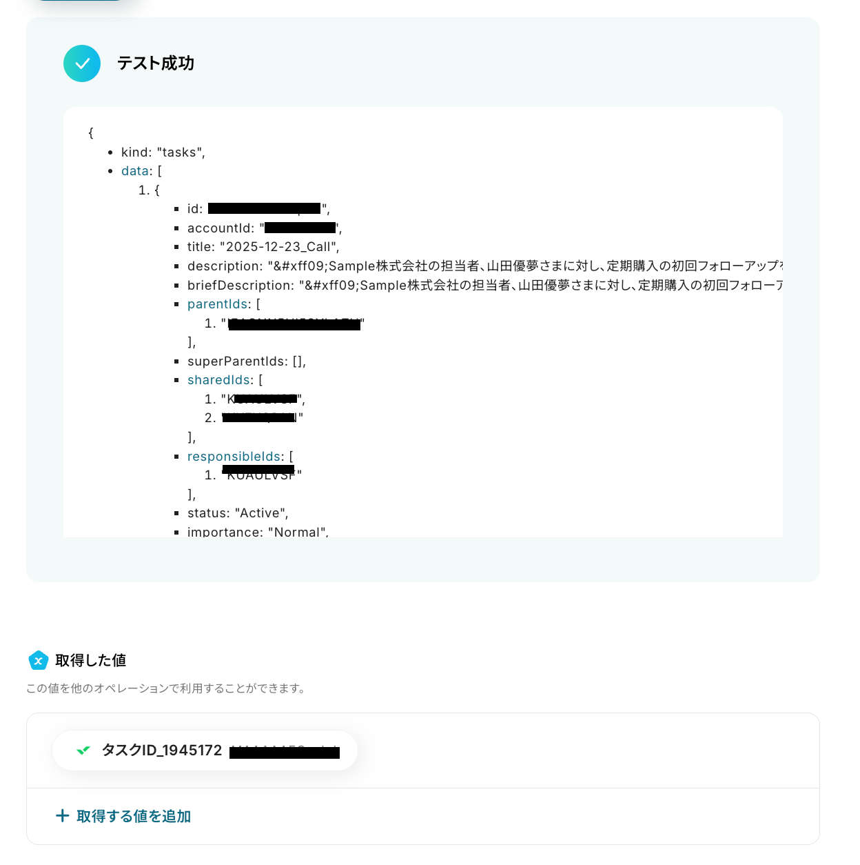 なお、「取得した値」を使わずに直接入力すると”固定値”となり、毎回同じタイトルのタスクが作成されるため、ご注意ください。