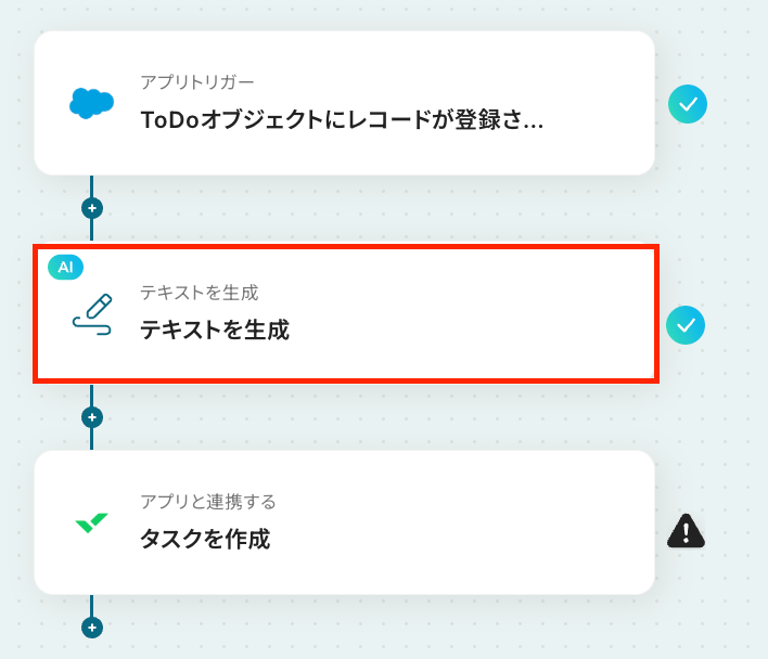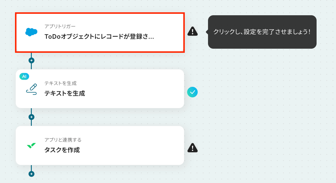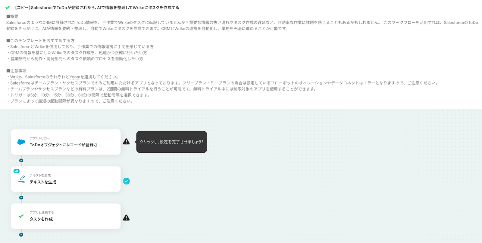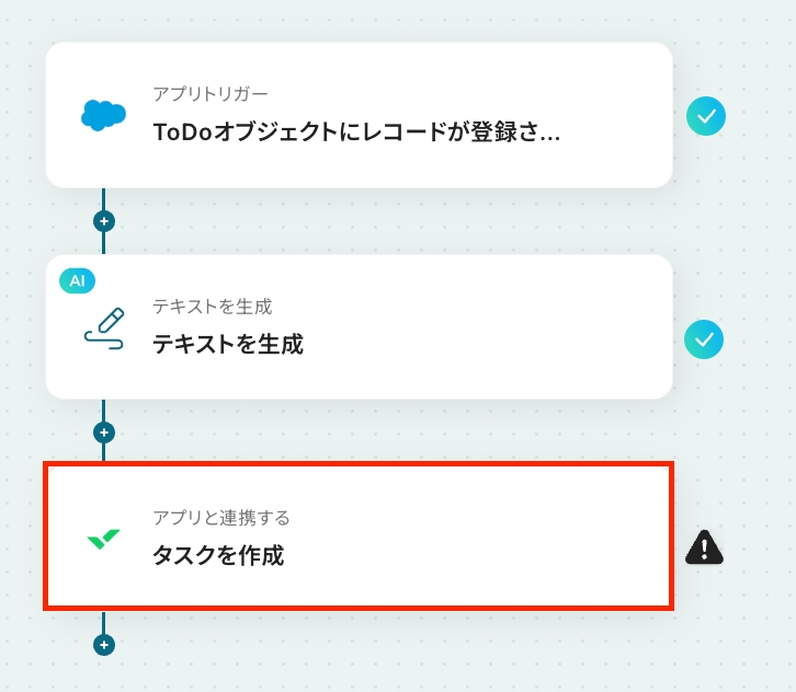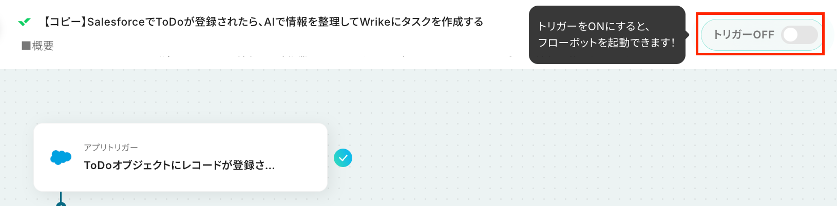 それではここから代表的な例として、「SalesforceにToDoが登録された際に、AIで情報を整理してWrikeにタスクを自動で作成する」フローの設定手順を解説していきます!