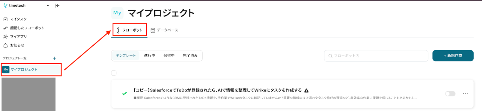 Yoomの画面左側にあるメニュー欄から「マイプロジェクト」にアクセスし、「フローボット」を選択すると、「【コピー】SalesforceでToDoが登録されたら、AIで情報を整理してWrikeにタスクを作成する」という名前で格納されているはずです。