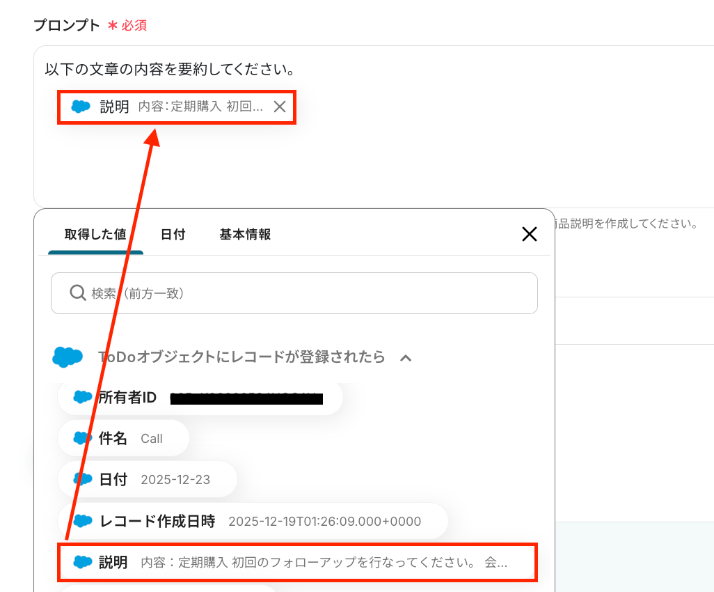 たとえば「要約してください。」など、毎回繰り返し同じ文章を使う定型的な内容は直接入力することで”固定値”となり、Salesforceの情報を引用したい部分は「取得した値」を使って設定することで”変動値”となります。