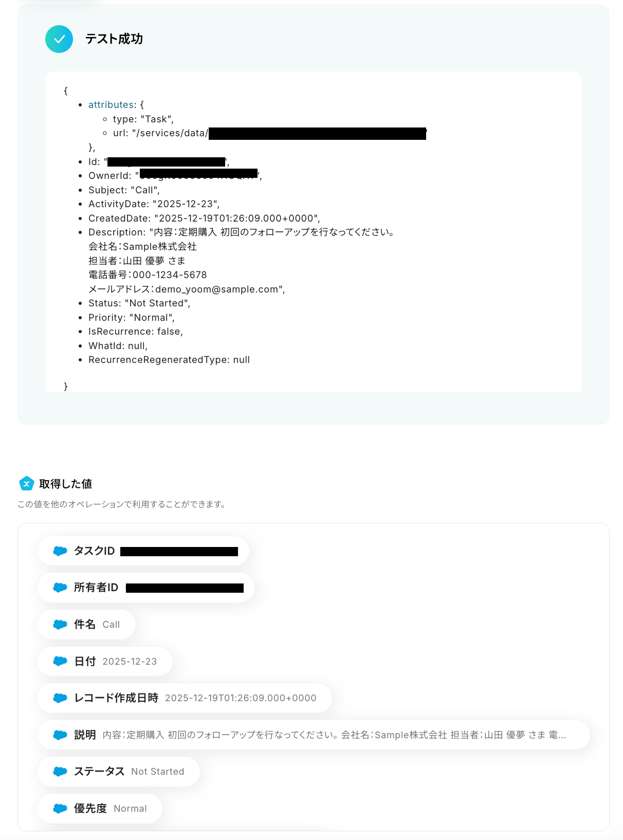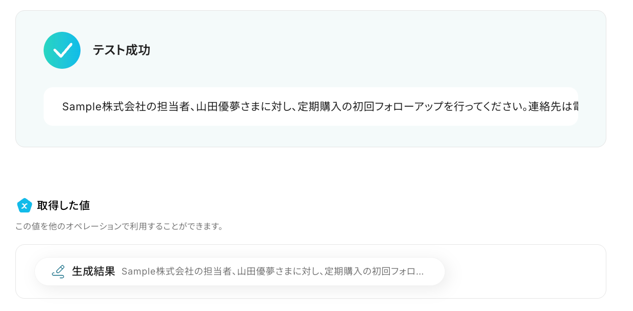 テストが成功すると、先ほど登録したレコードの情報が「取得した値」に抽出されるので、内容を確認しましょう。
