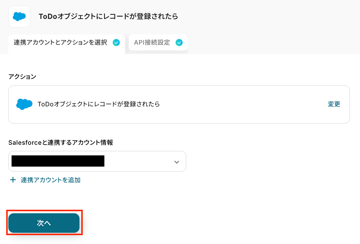 これまでと同じように連携アカウントと実行アクションの設定内容を確認し、「次へ」を押しましょう。