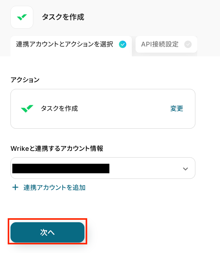 これまでのステップで取得した値を使って、Wrikeにタスクを自動作成する設定を行います。