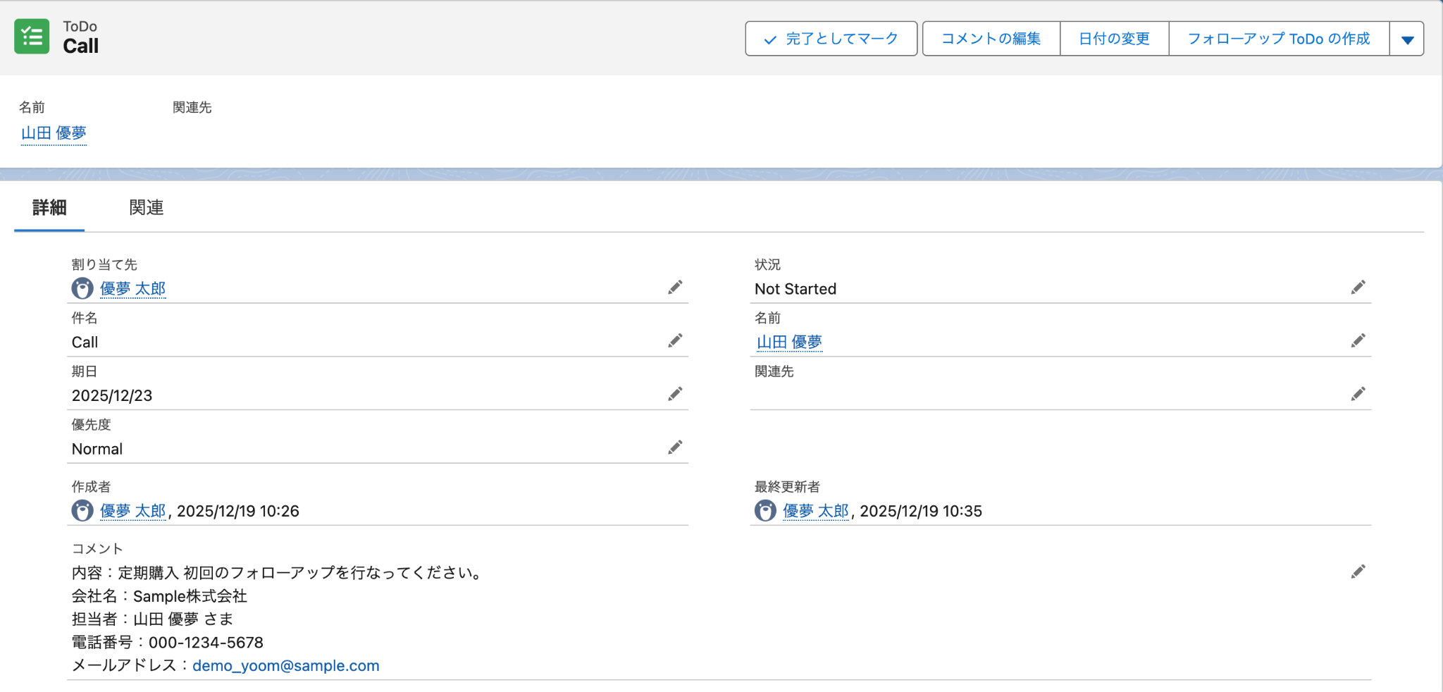 設定完了後は動作確認のためにテストを行いますので、SalesforceのToDoオブジェクトにレコードを登録してください。