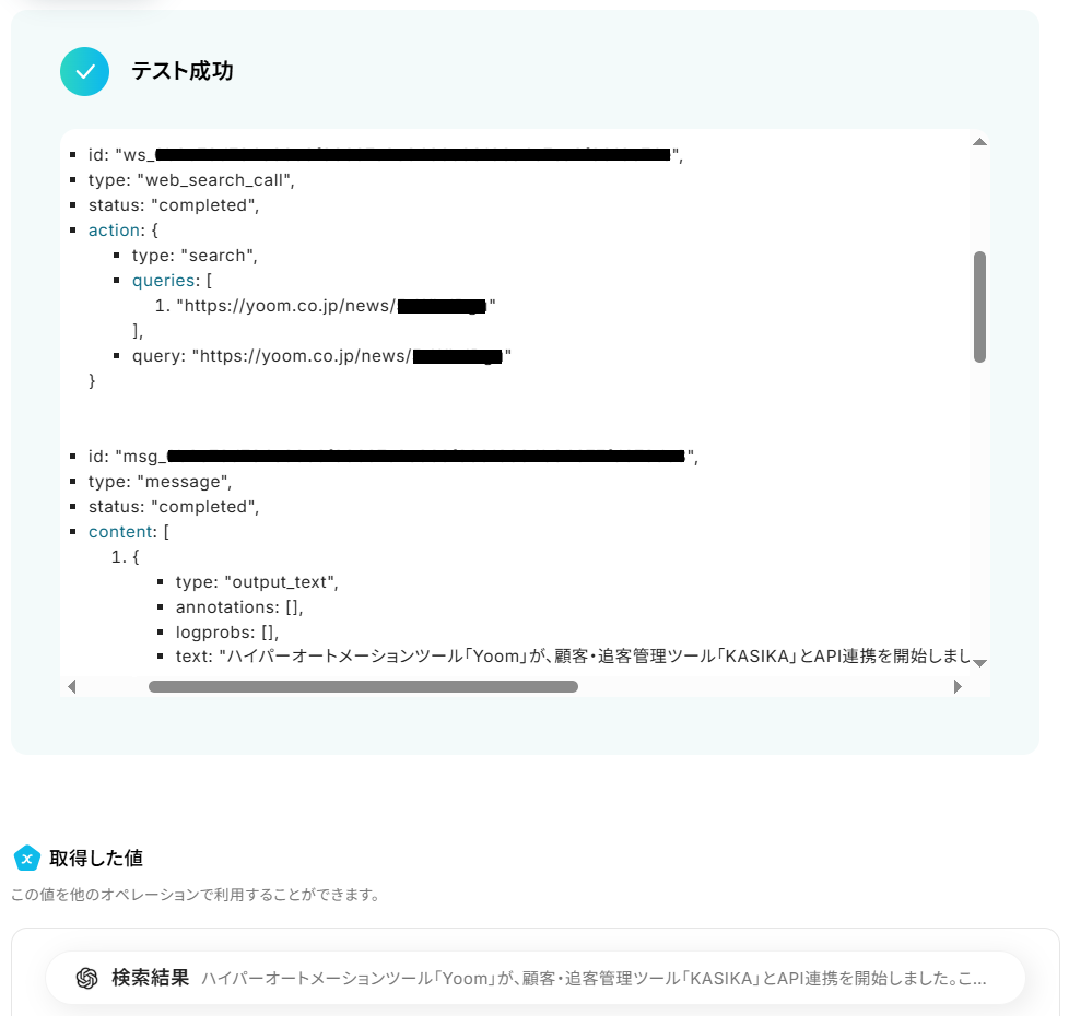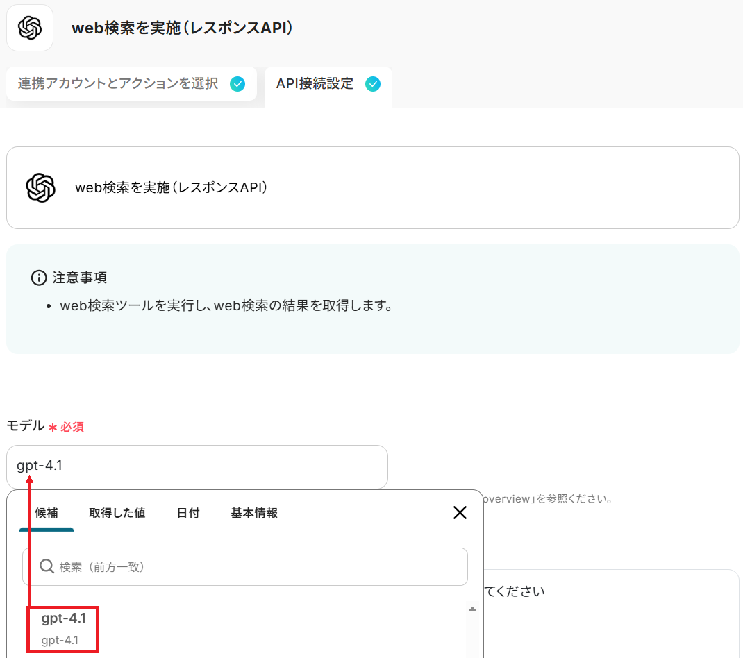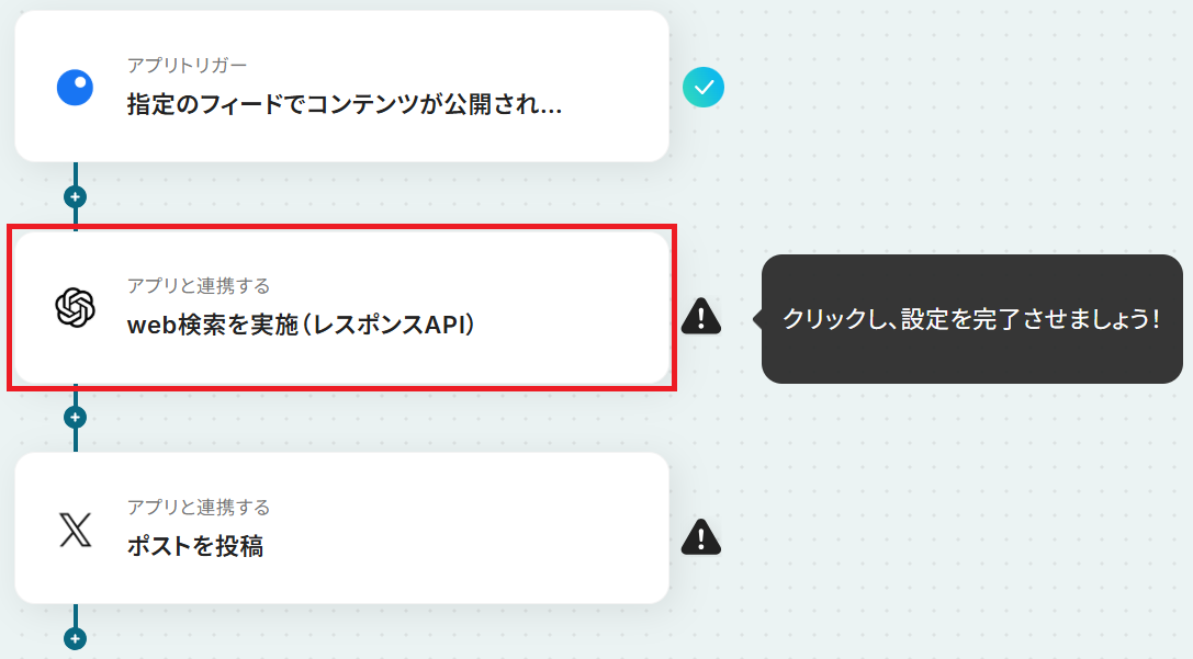 ステップ4:OpenAIのアクション設定 先ほど取得したInoreaderのコンテンツ情報をもとに、X(Twitter)の投稿内容をOpenAIで生成します。「web検索を実施(レスポンスAPI)」をクリックしてください。