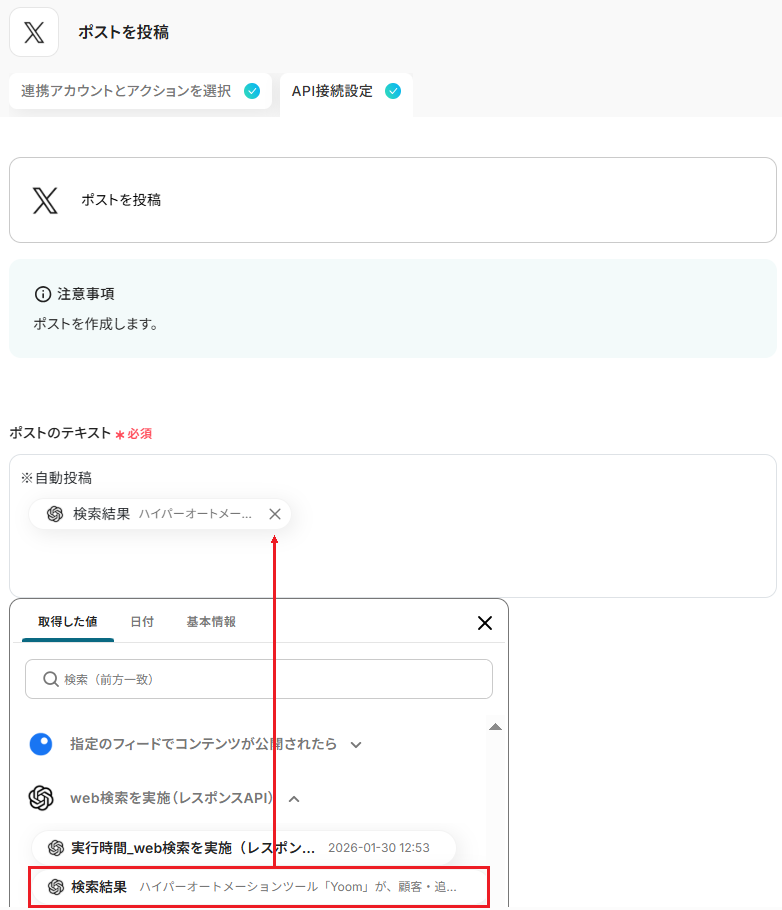ポストのテキスト の欄には、OpenAIから取得した「検索結果」の値が予め設定されています。 そのままでも大丈夫ですが、ステップ4で解説した通り固定のテキストを追加することも可能です。