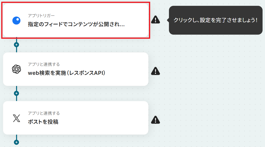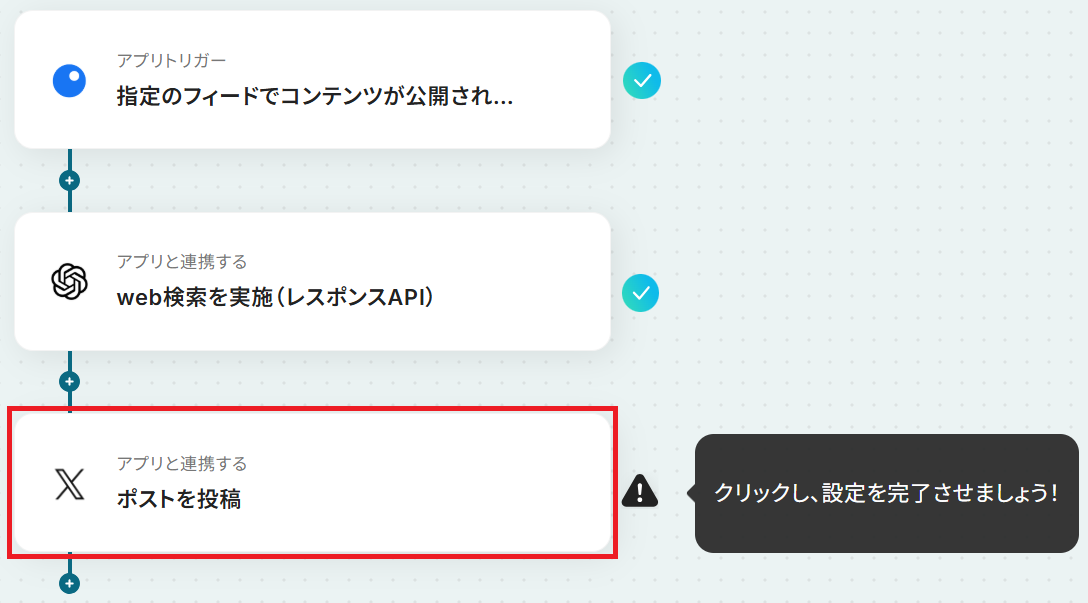 はじめに、Inoreader、OpenAI、X(Twitter)をそれぞれYoomと連携します 次に、トリガーでInoreaderを選択し、「指定のフィードでコンテンツが公開されたら」というアクションを設定します 次に、オペレーションでOpenAIの「web検索を実施(レスポンスAPI)」を設定し、公開されたコンテンツの内容を解析・要約させます 最後に、オペレーションでX(Twitter)の「ポストを投稿」を選択し、OpenAIが生成したテキストを投稿するように設定します ※「トリガー」:フロー起動のきっかけとなるアクション、「オペレーション」:トリガー起動後、フロー内で処理を行うアクション