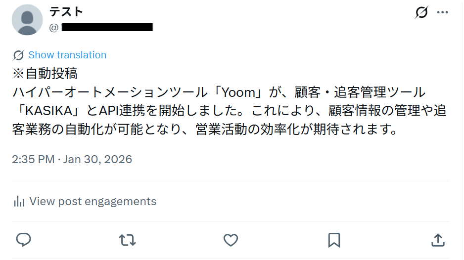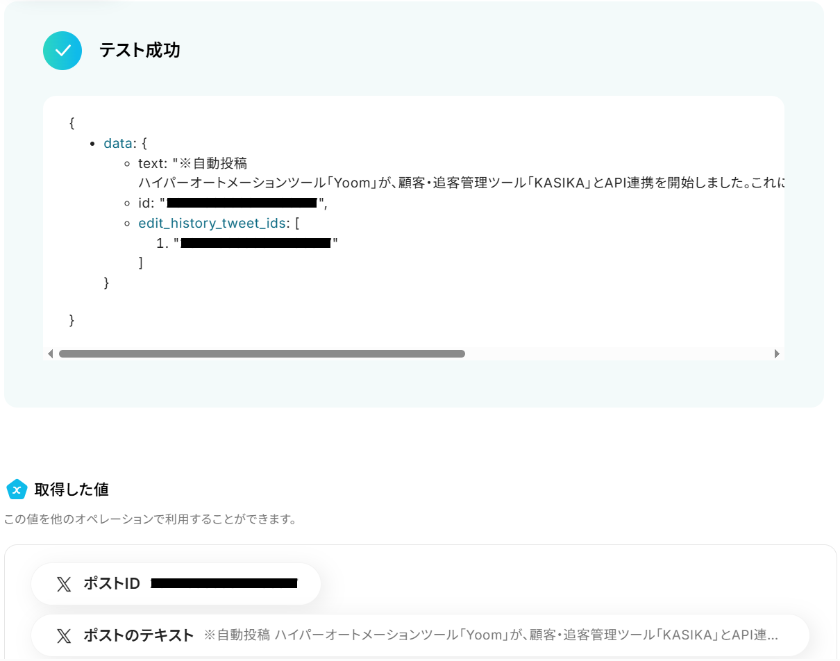 OpenAIでは、任意のモデルなどを設定できるほか、検索内容はトリガーで取得した情報を使用して自由にカスタマイズできます X(Twitter)へポストを投稿するオペレーションでは、投稿内容を任意にカスタマイズできます 例えば、OpenAIが生成した要約文を変数として本文に埋め込みつつ、特定のハッシュタグなどを固定値として追加する設定が可能です ■注意事項