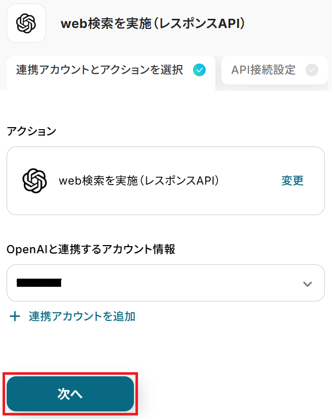 ステップ3と同様、アクションは「web検索を実施(レスポンスAPI)」のまま「次へ」をクリックします。