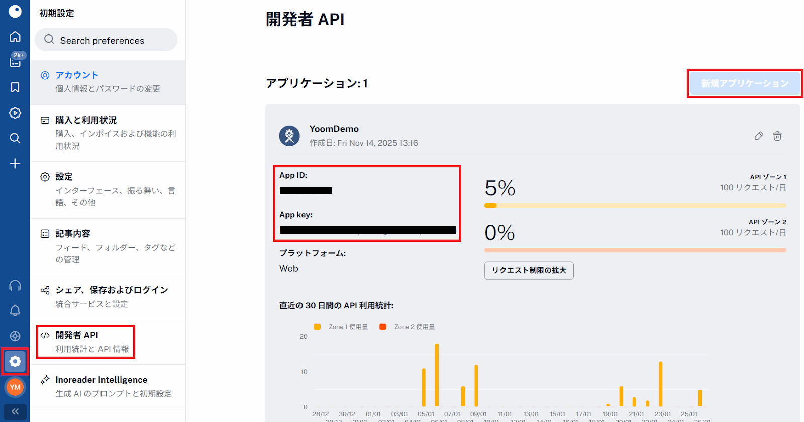 まずInoreaderにログインし、左下の歯車マーク から開発者 API に進んでアプリケーションを作成しましょう。そこでApp ID とApp key を取得できます。 ※アプリ作成時の情報はそれぞれ下記のように設定してください。