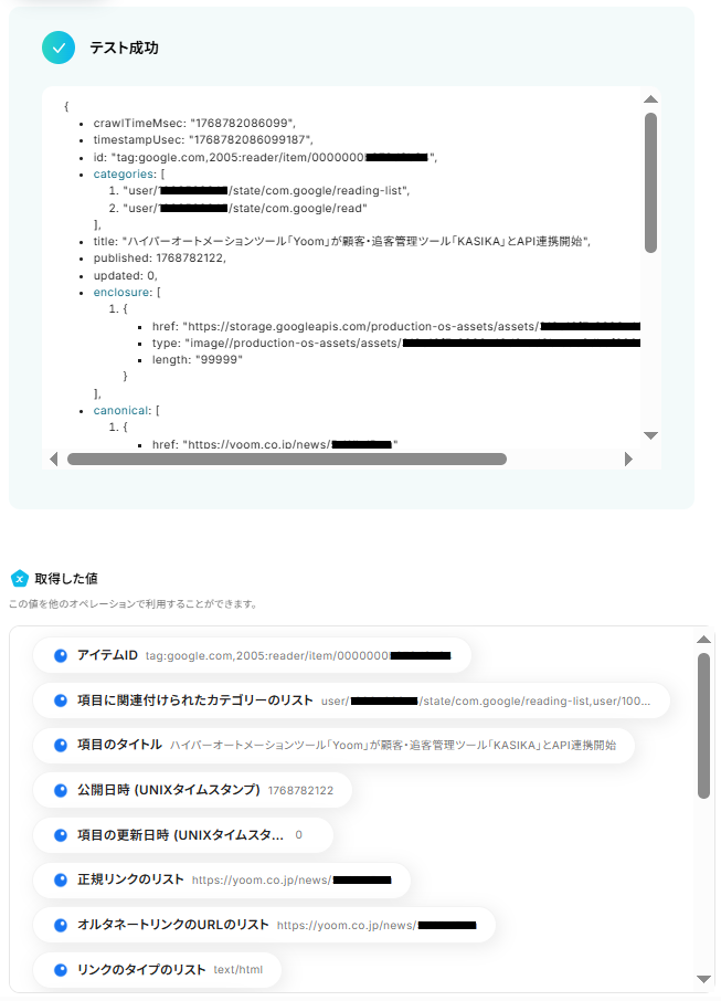 成功したら保存しましょう。ここで取得した値を次以降のステップで活用します。 ※取得した値 とは? トリガーやオペレーション設定時に「テスト」を実行して取得した値のことです。後続のオペレーション設定時の値として利用でき、フローボットを起動する度に変動した値となります。