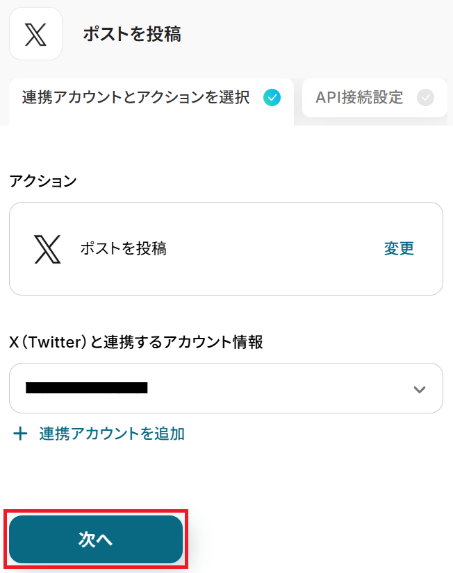 ステップ3・4と同様、アクションは「ポストを投稿」のまま「次へ」をクリックします。