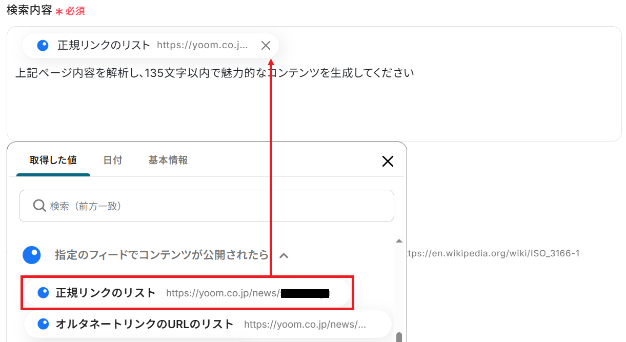 次に、Inoreaderから取得した「正規リンクのリスト」の値や固定の文章を組み合わせて、検索内容 (プロンプト)を入力してください。 以下のように取得した値を設定することで、トリガーが実行されるたびに最新のコンテンツが反映されます。※固定のテキストを加えてX(Twitter)に投稿したい場合は、その文字数を差し引いて指示しましょう。今回は「※自動投稿」という固定のテキストを加えて投稿する想定で、残りの135字以内で投稿内容を生成するよう指示しました。