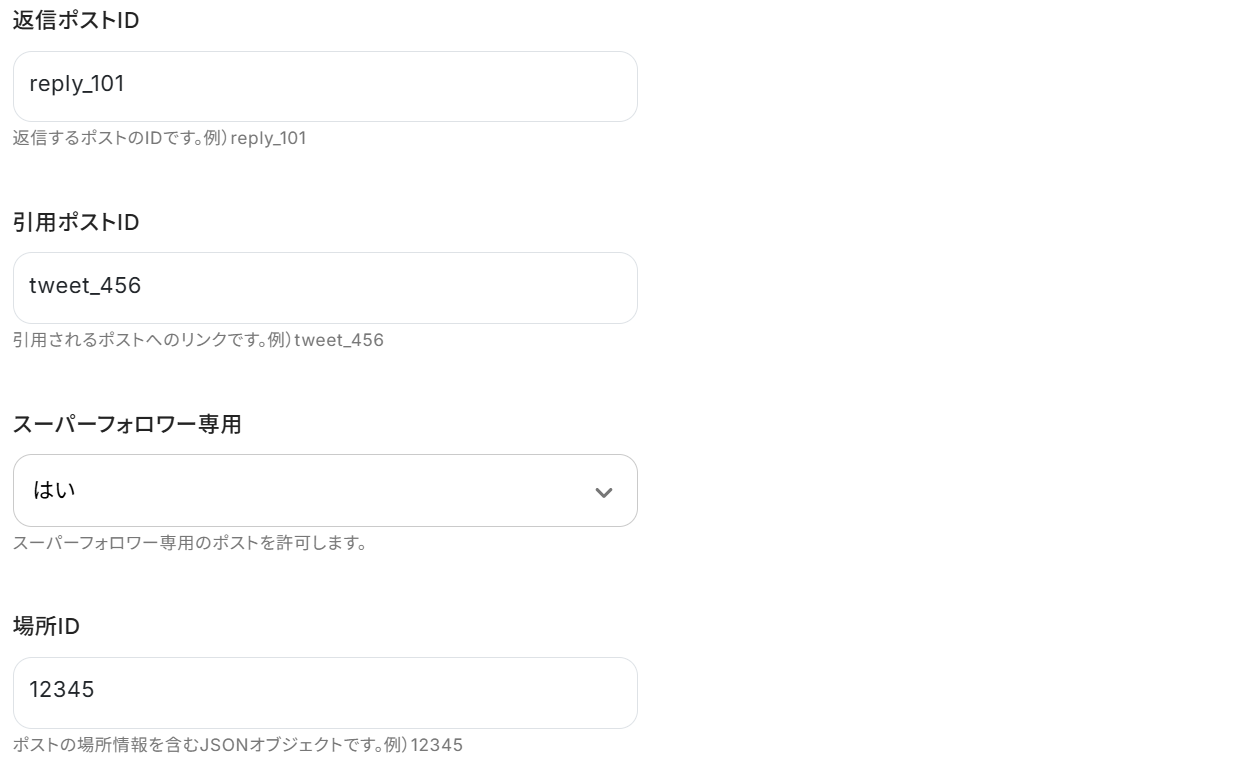 次にテキストボックス下部の説明を参考に、任意で返信ポストID や引用ポストID などを入力してください。
