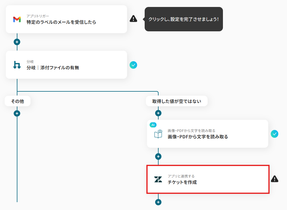 それでは、ここから実際に自動化を導入する設定方法について紹介します!今回はトリガーをGmailとし、「Gmailで受け取ったファイルをOCRで読み取り、Zendeskでチケットを作成する」 流れを例として解説します。