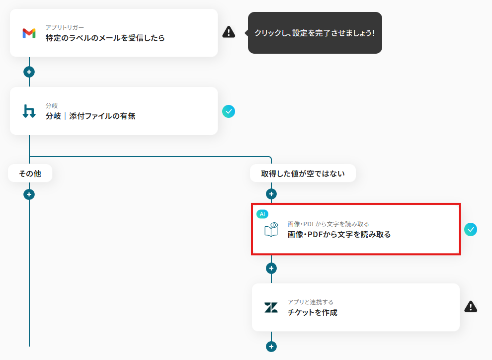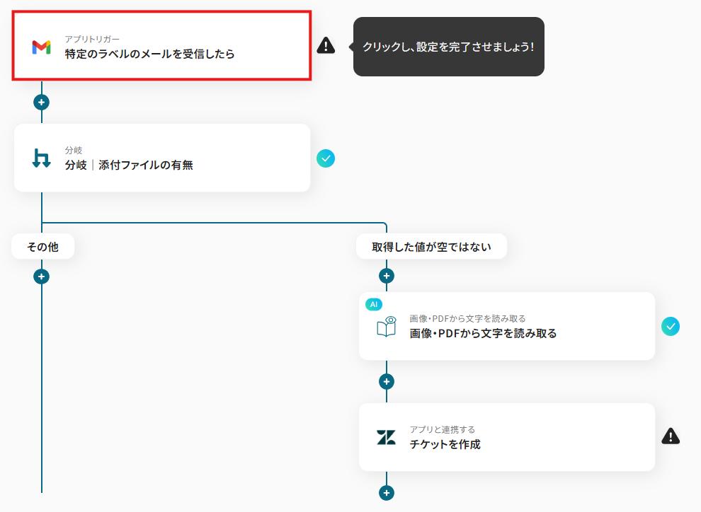 はじめに、GmailとZendeskをYoomと連携します。 次に、トリガーでGmailを選択し、「特定のラベルのメールを受信したら」というアクションを設定します。 続いて、オペレーションで分岐機能を設定し、受信したメールに添付ファイルがあるかどうかで処理を分けます。 添付ファイルがある場合、オペレーションでAI機能の「画像・PDFから文字を読み取る」を設定し、ファイル内容をテキスト化します。 最後に、オペレーションでZendeskの「チケットの作成」を設定し、OCRで読み取った情報を基にチケットを作成します。 ※「トリガー」:フロー起動のきっかけとなるアクション、「オペレーション」:トリガー起動後、フロー内で処理を行うアクション