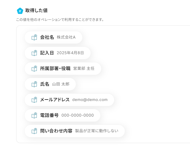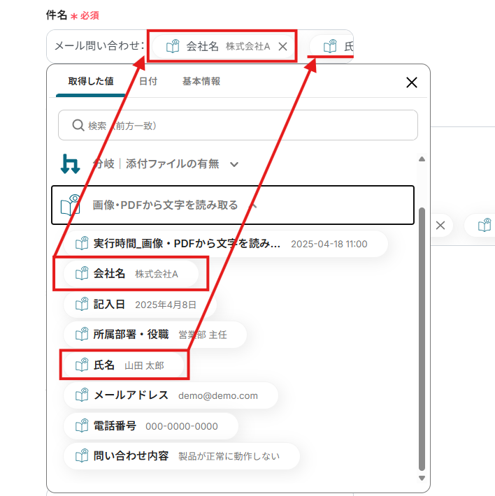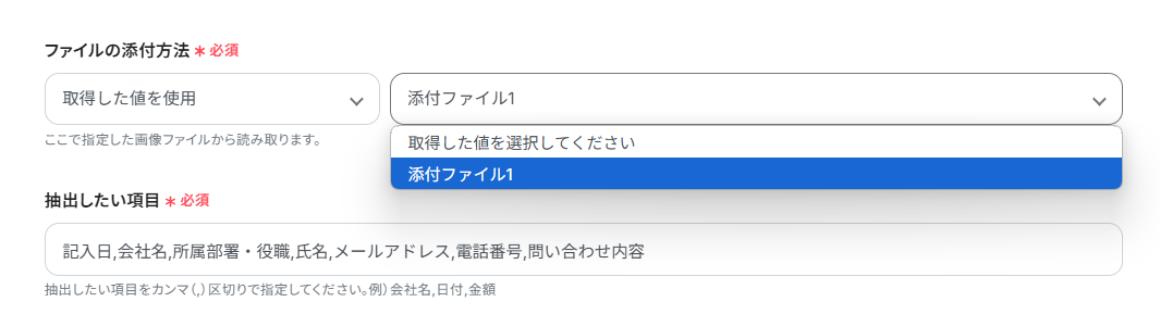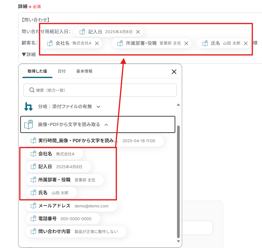 AI機能のOCR設定では、読み取る書類の種類に応じて、読み取りたい項目(例:会社名、担当者名、問い合わせ内容など)を任意で設定できます。 Zendeskでチケットを作成する際に、件名や本文、カスタムフィールドなどに、AI-OCRで読み取った情報を変数として自由に埋め込むことが可能です。 ■注意事項