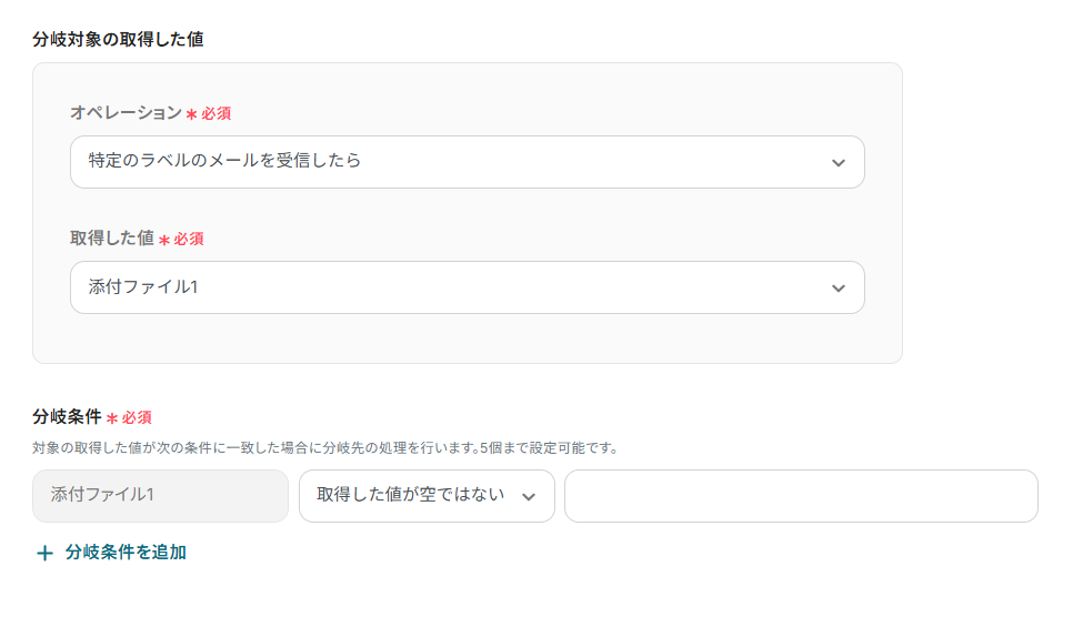 オペレーションに「特定のラベルのメールを受信したら」、アウトプットに検知したい項目を設定します。 「分岐条件」は、分岐先の処理を行う条件を設定します。