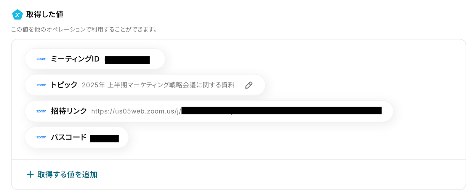 テストが成功すると、自動作成されたZoomミーティングの情報がアウトプットとして取得できます。