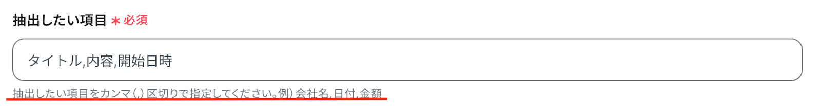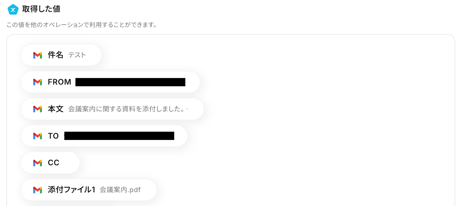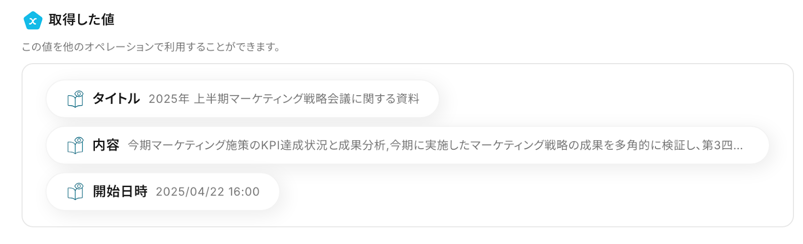 入力欄をクリックすると「取得した値」が表示されるので、ここから前の設定で取得したアウトプットのデータを引用できますよ!