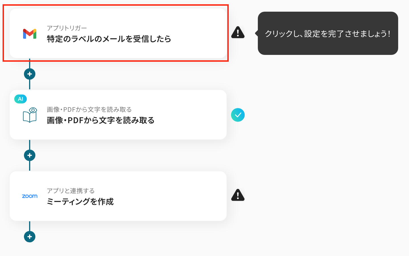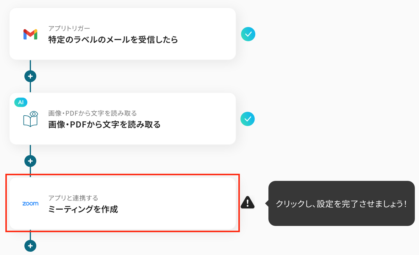 今回は例として、「Gmailで受信した添付ファイルをOCRで読み取り、Zoomでミーティングを作成する」業務フローを自動化していきます。