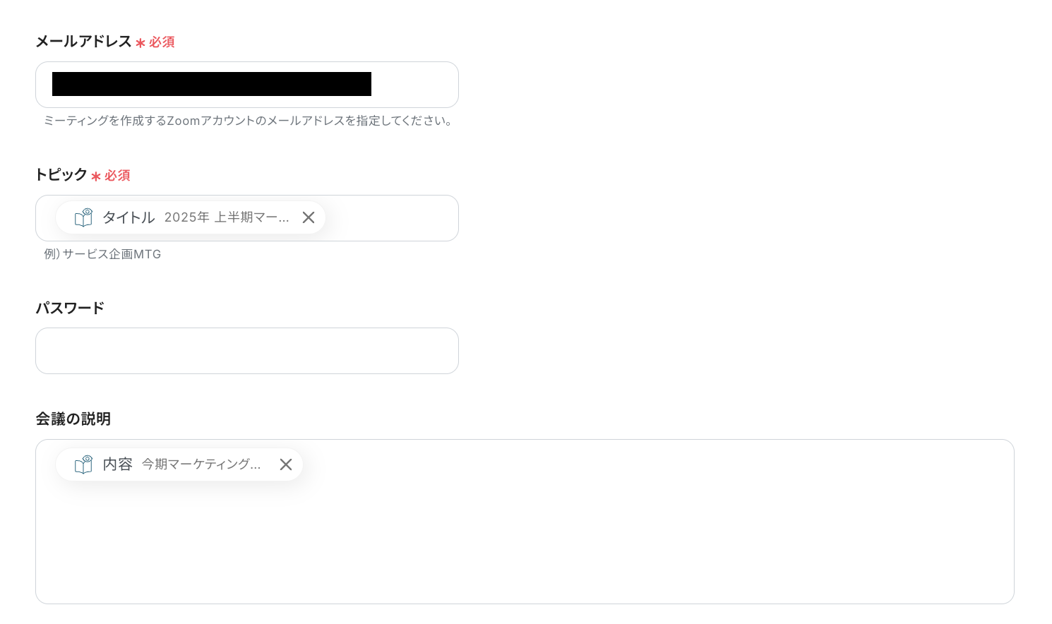 トピック、会議の説明、開始日時には、先ほど「画像・PDFから文字を読み取る」設定で取得したアウトプットが設定されています。