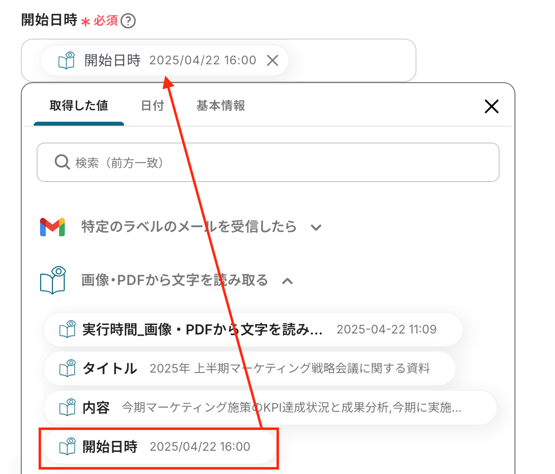 ※以下の画像は、例として、「開始日時」をアウトプットから引用して設定する方法です。