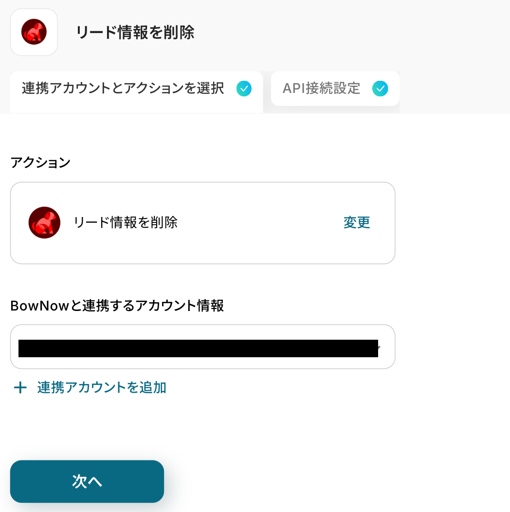 - 最後に、オペレーションでBowNowの「リード情報を削除」アクションを設定し、トリガーで取得した情報を紐付けます。