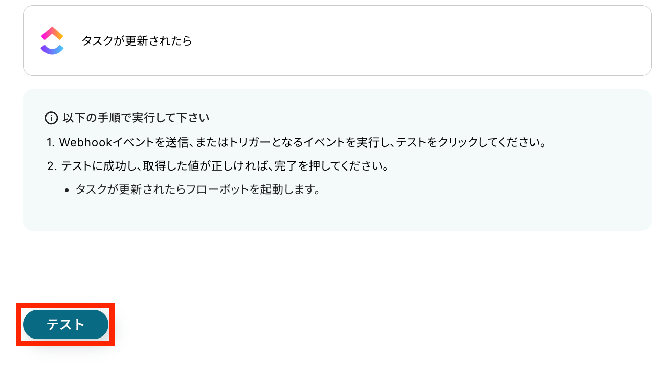 WebhookURL登録の確認ができたら、「ClickUpでタスクが更新されたときに通知を受け取る設定(Webhook)」が正常に登録・接続されていることを示しています。