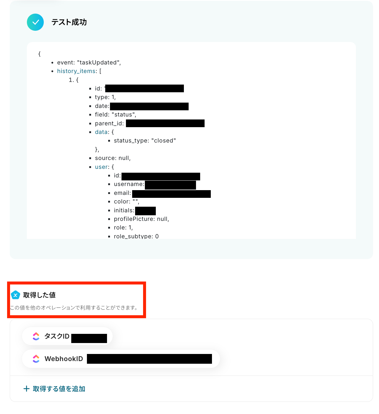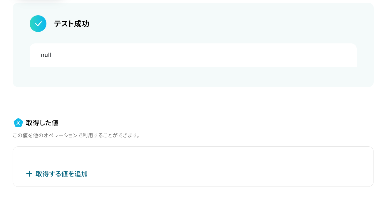 「テスト成功」と表示が出たら、取得した値が取得されます。