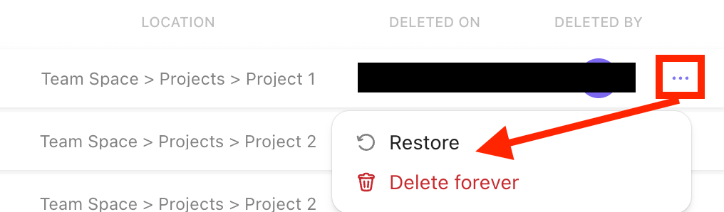 ClickUpのアプリ上では、30日間タスクが完全に削除されずに復元が可能な状態で補完されています。ClickUp上のゴミ箱から赤枠をクリックし「Restore」を選択して復元してください。