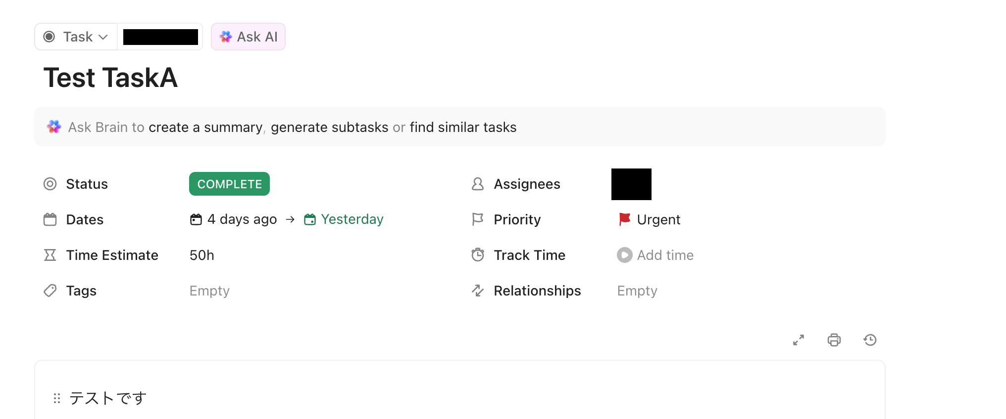 ClickUp上でテストのためのタスクを更新します。