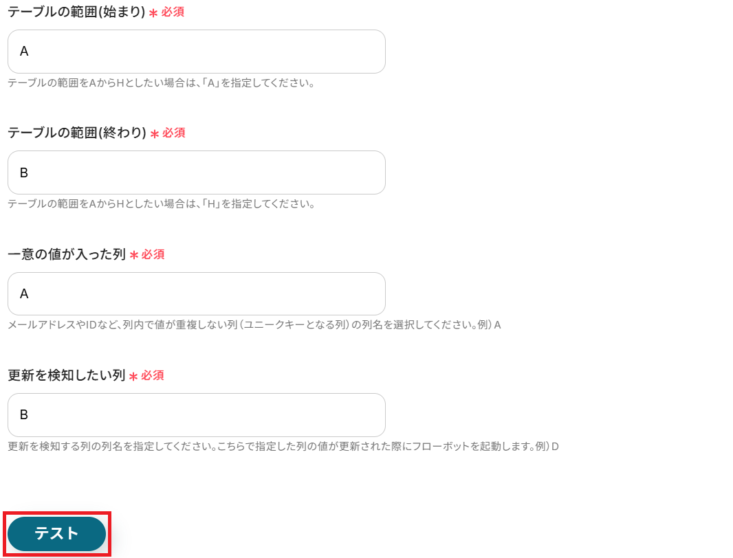 「更新を検知したい列」は削除のチェックが入ったB列としました。