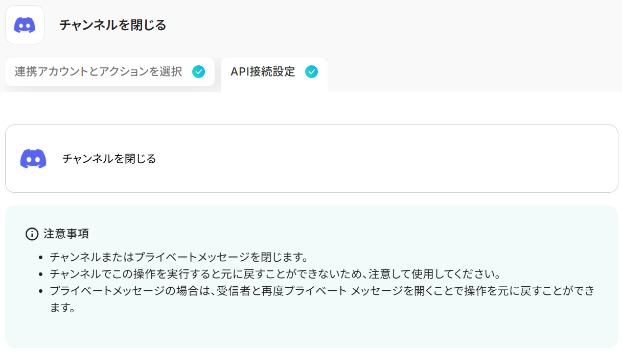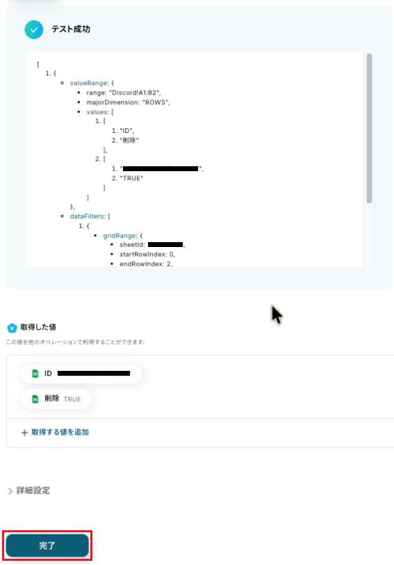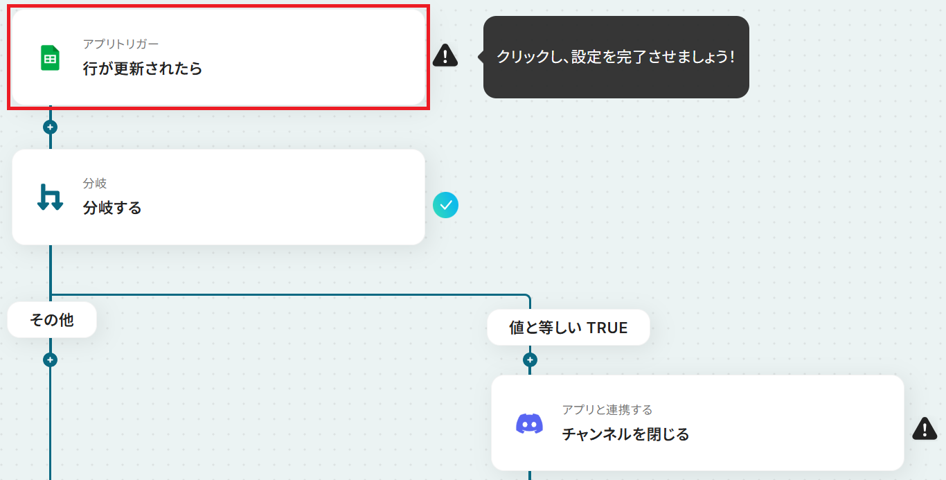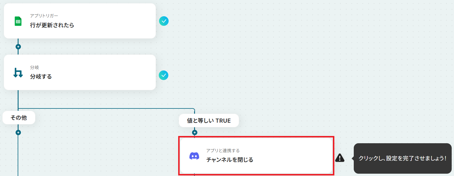 Google スプレッドシートのトリガー設定では、監視対象としたい任意のスプレッドシートIDとシート(タブ)名を設定してください 分岐機能のオペレーションでは、チャンネル削除を実行する条件(例:特定の列の値が「完了」になった場合など)を任意で設定してください Discordのオペレーションでは、削除対象のチャンネルIDを任意で設定してください。トリガーで取得したGoogle スプレッドシートの情報をアウトプットとして指定可能です ■注意事項